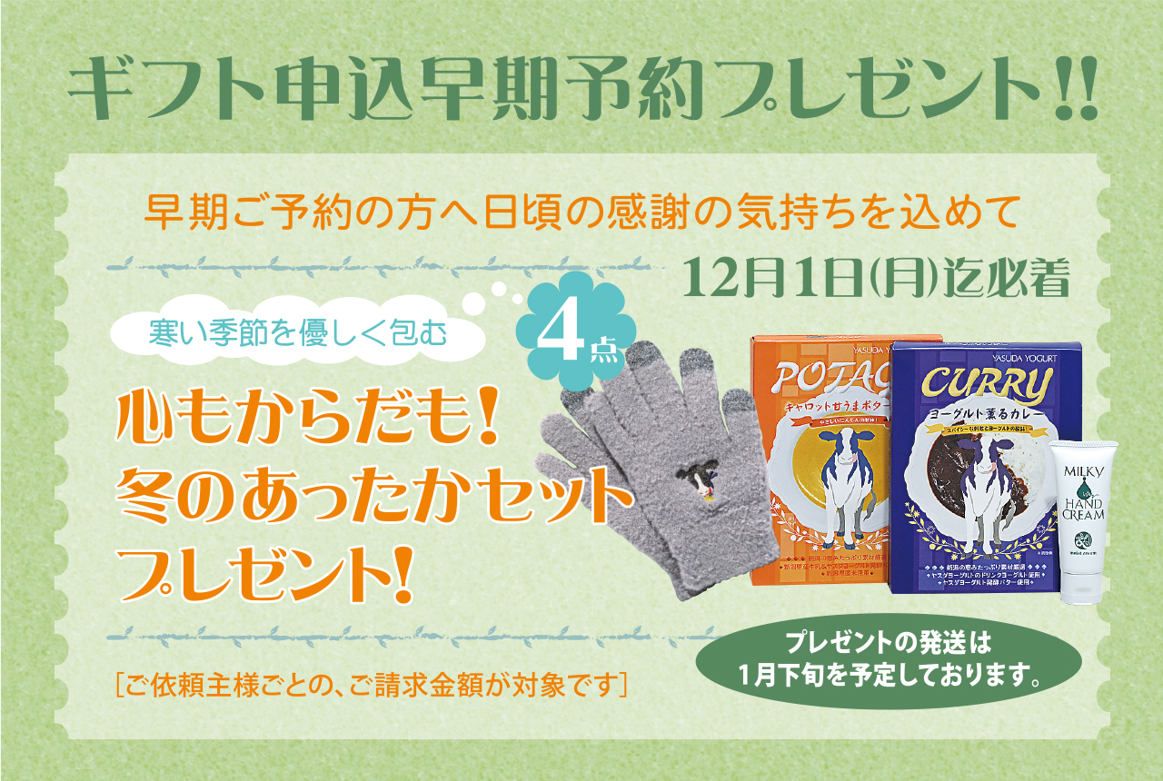 - ギフト申込早期予約で「心もからだも!冬のあったかセット」プレゼント! 詳しくはこちらから。